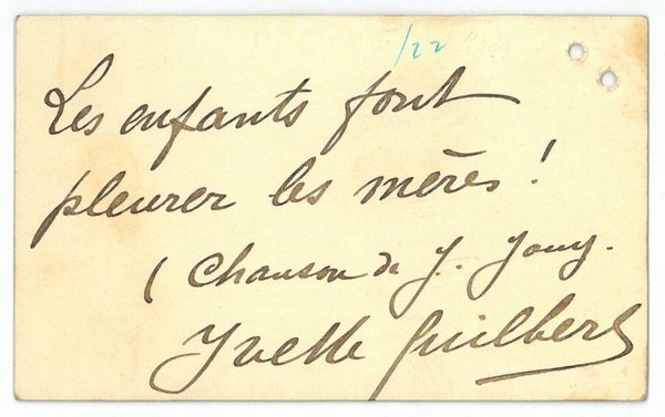 1 S. Visitkartenformat. Les enfants font pleurer les mères. - Mit zwei kleinen Löchern am oberen Rand.