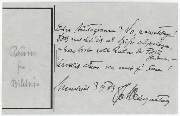 1 S. Qu.-8vo. Ein Autogramm? Na, meinetwegen! / Doch möcht' ich als Buße auferlegen, / - Was bisher wohl kaum der Fall gewesen - / Wirklich etwas von mir zu lesen!