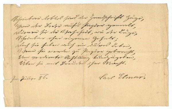 1 S. Qu.-gr.-8vo. Scheinbar leblos sind der Handschrift Züge, | Von der Feder auf's Papier gemalt, | Dienen sie der Wahrheit wie der Lüge, | Scheinbar ohne eigene Gestalt; | Doch sie haben auch ein inn'res Leben, | Wenn sie werden zu Papier gebracht, | Um verdiente Achtung kundzugeben | Üben sie mit Freuden ihre Macht [.]". - Mit stärkeren Randläsuren.
