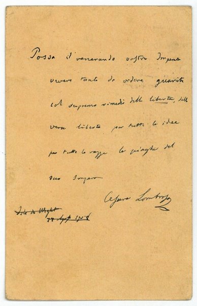 1 S. 8vo. Mit eh. Adresse. Auf einer an die Österreichische Illustrierte Zeitung adressierten Postkarte: "Possa il venerando vostro Imperatore vivere tanto de vedere quarito col supremo rimedio della liberta, della vera liberta per tutte le idee, per tutte le razze le piaghe del suo impero". - Beiliegend eine zeitgenöss. Abschrift sowie eine von selber Hand stammende Übersetzung ins Deutsche ("Möge Ihr verehrungswürdiger Monarch solange leben bis die Wunden seiner Reiche geheilt sind durch das beste Heilmittel, der Freiheit, der wahren Freiheit aller Gedanken und aller Völkerstämme").