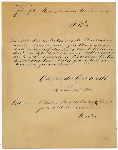 ¾ S. auf Doppelblatt. 4to. An das k. k. Ministerium des Inneren: "Ich stelle das unterthänigste Ansuchen mir die Bewilligung zur Annahme und Tragung des mit laut beiliegendem Decrete verliehenen Ritterkreuzes des K. portugiesischen Christus Ordens Allerhöchsten Ortes geneigtest erwirken zu wollen [.]". - Geboren in Graz, schlug der gelernte Schlosser nach dem Tod seines Vaters eine musterhafte Schauspielerkarriere ein, die ihn an zahlreiche in- und ausländische Bühnen, schließlich auch zum Film führte. Girardi, der "zum wahrscheinlich größten Volksschauspieler der Theatergeschichte avancierte" (Haeusserman, Das Wiener Burgtheater, Wien u. a., Molden, 1975, S. 88), war in erster Ehe mit der Schauspielerin Helene Odilon (1865-1939) gestraft, die ihn irrenärztlich behandelt wissen wollte; in zweiter Ehe etwas glücklicher mit Leonie von Latinovicz (gest. 1918), der Ziehtochter des Klavierfabrikanten Ludwig Bösendorfer (1835-1919) verheiratet, waren seiner Laufbahn nur zwei Rollen und dreizehn Auftritte am Burgtheater beschieden, da er kurze Zeit später verstarb. - Ohne das erwähnte Dekret; mit kl. Randläsuren und etwas angestaubt.