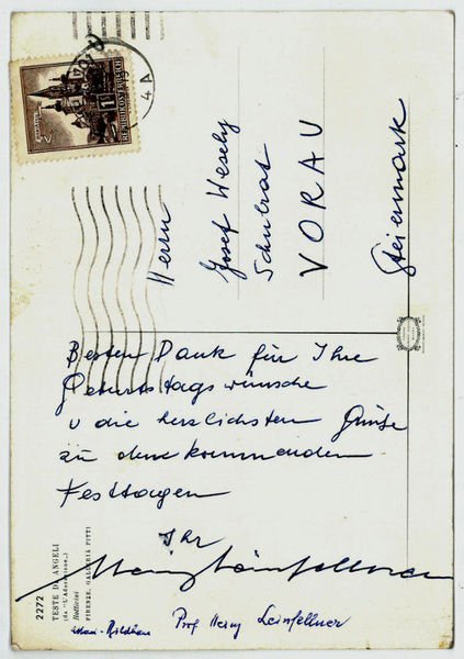 1 S. Qu.-8vo. Dankt Josef Wesely für ihm übersandte Geburtstagswünsche. - Leinfellner besuchte die Grazer Kunstgewerbeschule und studierte u. a. bei Anton Hanak an der Wiener Akademie der bildenden Künste. Von 1946-52 war er bei Fritz Wotruba an der Akademie zunächst als freier Mitarbeiter, seit 1948 auch als dessen Assistent tätig; 1959 wurde er Professor und Leiter der Meisterklasse für keramische Plastik an der Akademie. Sein Werk umfaßt Bronzefiguren, Steinplastiken, Reliefs, Portraits, Marmorintarsien und Keramikarbeiten. Leinfellner gehörte 1947 zu den Mitgliedern des Art Club (1947). Vgl. Czeike IV, 16.