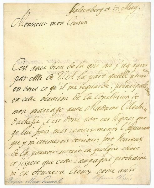 2 SS. auf Doppelblatt. 4to. Mit Dank für gute Wünsche zum soeben abgeschlossenen Ehevertrag mit dem Hause Habsburg: "Monsieur mon cousin. C'est avec bien de la goie que j'ay apris par celle de V. A. la part quelle prend en tout ce qu'il me reguarde, principalement en cette occasion de la conclusion de mon mariage avec Madame l'Archiduchesse. C'est donc par ces lignes que ge lui fais mes remersiments l'assurance que je m'estimerois consiours fort heureux de la pouvois servir en quelque chose et j'espere que cette campagne prochaine m'en donnera lieux come aussi de l'assurer moi mesme combien je suis et serez tousiours / Monsieur mon cousin / de Votre Altesse / tres affectionne serviteur et cousin / M. Emanuel Electeur." - 1684 hatte Kurfürst Max Emanuel um die Hand der Erzherzogin Maria Antonia angehalten, Tochter Kaiser Leopolds I. und der Margarethe von Spanien. "Der Kontrakt vom 12.4./15.5.1685 legte ein Heiratsgut von 100.000 fl. und eine Ausstaffierung der Braut mit 200.000 fl. fest. Maria Antonia und Max Emanuel mußten auf das spanische Erbe mit Ausnahme der Niederlande, die dem Kurfürsten in Aussicht gestellt wurden, verzichten. Er tat dies leichten Herzens: Schließlich blieb seine Frau Infantin von Spanien, und der Vertrag konnte infolge von Verfahrensmängeln angefochten werden. Als Nahziel behielt der Kurfürst das spanische und als Fernziel das österreichische Erbe im Auge" (NDB XVI, 181). Während Max Emanuel seine Frau schlecht behandelte (sie sollte 1692 vor Kummer in Wien sterben), erwarb sich der Kurfürst im Großen Türkenkrieg den Ruf eines bedeutenden Feldherrn. Bei der Wiener Türkenbelagerung 1683 hatte er mit 11.000 Soldaten eingegriffen: Mit bayerischer Beteiligung gelang es Kaiser Leopold I. und dem polnischen König Sobieski, Wien von den Türken zu befreien. Max Emanuel war einer der wenigen Fürsten, die sich persönlich an der Schlacht beteiligten; die Osmanen nannten ihn wegen seiner blauen Uniformjacke, die weit über die Schlachtfelder zu sehen war, den "Blauen König".