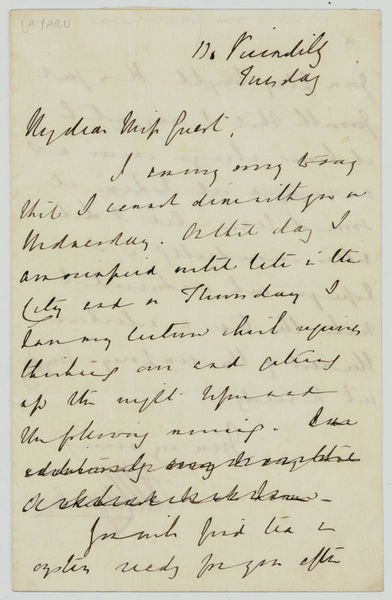 2 SS. auf Doppelblatt. 8vo. An eine Miss Guest (?) mit der Absage zu einer Verabredung: "I am very sorry to say that I cannot dine with you on Wednesday. On that day I am occupied until late in the City and on Thursday I have my lecture which requires thinking on [.]". - A. H. Layard erforschte neben Ninive und Nimrud auch archäologische Stätten im südlichen Mesopotamien (darunter Babylon) und war der erste Europäer, der umfänglich über die Jesiden in Scheichan und dem Dschabal Sindschar berichtete, deren "Fest der Versammlung" (Jashne Jimaiye) er in Lalisch erleben konnte. Aufsehenerregende Funde aus seinen Ausgrabungen schickte Layard in das Britische Museum nach London, in dessen Verwaltung er 1866 als trustee berufen wurde. Seit 1852 war er in der britischen Politik aktiv, unter anderem als Abgeordneter im Unterhaus und als Botschafter in Konstantinopel (1877-80). - Die Verso-Seite von Bl. 2 mit alten Montagespuren.