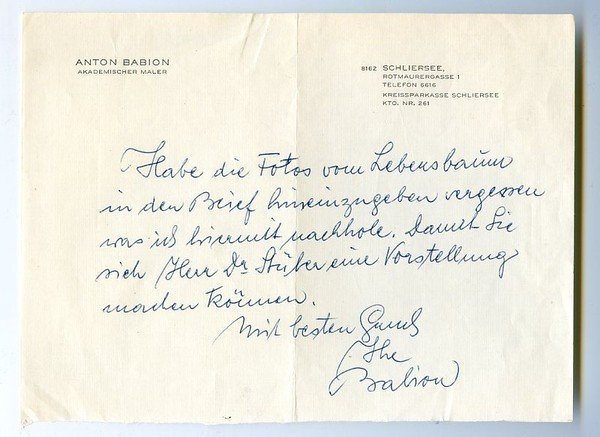 1 S. Qu.-gr.-8vo. An einen namentlich nicht genannten Adressaten: "Habe die Fotos vom Lebensbaum in den Brief hineinzugeben vergessen was ich hiermit nachhole [.]". - Auf Briefpapier mit gedr. Briefkopf.