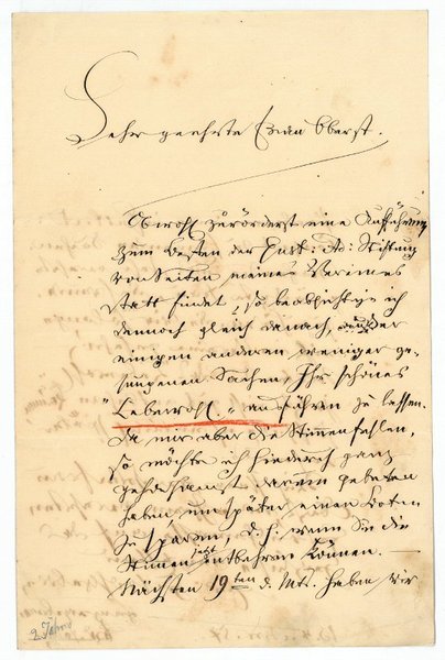 2 SS. auf Doppelblatt. Gr.-8vo. An eine "Frau Oberst", deren "Lebewohl" er bei einem Konzert aufführen möchte: "[.] Da mir aber die Stimmen fehlen, so möchte ich hierdurch ganz gehorsam darum gebeten haben, um später einen Boten zu sparen, d. h. wenn Sie die Stimmen jetzt entbehren können [.]". - Friedrich Wilhelm Jähns wurde von Charles Detroit in Musik unterwiesen und sang im Chor der Kgl. Oper Sopran. Nach der Ausbildung bei Stümer und Lemm studierte er Musiktheorie bei Louis Gorzizky, feierte Erfolge als Sänger, Komponist und Pianist und gründete 1845 den Jähnsschen Gesangsverein. "Seit 1849 war er Kgl. Musikdirektor, seit 1881 auch Lehrer für Rhetorik am Konservatorium von Scharwenka. Er baute die Sammlung Carl Maria von Weber auf und schrieb 'Carl Maria von Weber in seinen Werken' (1871)" (DBE).
