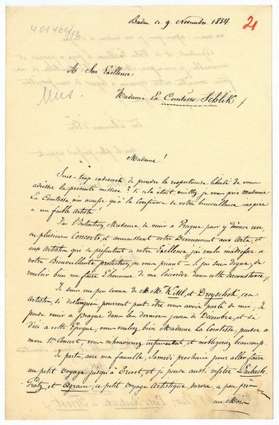 2 SS. auf Doppelblatt. Gr.-8vo. In französischer Sprache an Sophie Gräfin Schlik (1831-61), Gattin von Heinrich Franz Graf Schlik zu Bassano und Weißkirchen in Prag: "Suis trop indiscrète de prendre la respectueuse liberté des vous addresser la présente missive? Si cela était, veuillez, je vous prie Madame La Comtesse, n'eu accuser qu'à la confiance de votre bienveillance inspire a un faible artiste! J'ai l'intention, Madame, de venir a Prague pour y donner un ou plusieurs concerts, et connaissant votre devouement aux arts, et aux artistes qui se présentent a votre Excellence, j'ai voulu m'adresser a votre bienveillante protection [.] Je suis un peu connu de MM. Kittl et Dreyschok [.] Je parte, avec ma famille, Samedi prochaine pour aller faire un petit voyage jusqu'à Triest, et je pense aussi visiter Laibach, Gratz, et Agram [.]". - Laut beiliegender, um die Jahrhundertwende angefertigter Sammlernotiz stammt der Brief vom Bariton Manuel Patricio García, dem Erfinder der Laryngoskopie und einzigen Sohn des Tenors Manuel del Pópulo Vicente García (1775-1832), möglicherweise aber von fremder Hand, vielleicht der seines Sohns Manuel Garcia (1836-85).