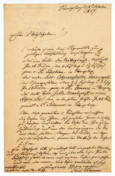1 S. auf Doppelblatt. 8vo. An einen Galeristen oder Ausstellungskurator: “[.] erlaube ich mir, drei Ölgemälde zur gütigen Ausstellung anzutragen. Das eine Bild ‘Die Mittagsruhe’ [.] von H[ermann] Löschin in Königsberg. Das andere Bild: Ostpreußischer Tannenwald [.] - gem. v. H[ugo] Knorr in Königsberg. Das dritte Bild: (Helle Mondnacht an einem Alpensee) [.] gemalt von C. Scherrer in Königsberg [.]”. - Nach einem Studium an der Universität Königsberg unternahm Scherres Studienreisen durch die Schweiz, Oberitalien und das Rheinland, lebte in Danzig, Königsberg und schließlich in Berlin, wo er an der Berliner Künstlerinnenakademie die Klasse für Landschaftsmalerei leitete. Vgl. Thieme/Becker XXX, 36. - Auf Bl. 2 verso ein Vermerk von alter Hand.