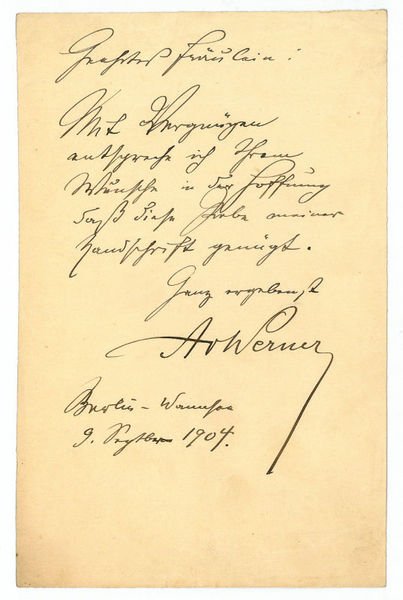 1 S. 8vo. An eine Autographensammlerin: "Mit Vergnügen entspreche ich Ihrem Wunsche in der Hoffnung, daß diese Probe meiner Handschrift genügt [.]". - Werner, seit 1875 Direktor der Akademischen Hochschule für bildende Künste in Berlin, hatte auf Fürsprache des Großherzogs von Baden im Hauptquartier der III. Armee am Deutsch-Französischen Krieg 1870/71 teilgenommen; mit der Darstellung von Schlachten, Staatsereignissen und Hoffeierlichkeiten betraut, wurde er zum "bevorzugten Maler des Kaiserreiches" (DBE), als dessen Hauptwerk die Darstellung der Kaiserproklamation in Versailles (1885) gilt. Der modernen Kunst seiner Zeit ablehnend gegenüberstehend, gipfelte sein Widerwille in der Schließung der Edvard-Munch-Ausstellung 1892, was schlußends Auftakt zur Gründung der Berliner Secession durch Max Liebermann und Walter Leistikow 1898 war.