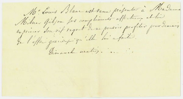 1 S. auf Doppelblatt. 9,8:18,3 cm. Mit eh. Adresse. In französischer Sprache an Madame Milner Gibson, der er für eine Einladung dankt, die er leider nicht wahrnehmen werde können. - Der überzeugte Demokrat, Theoretiker der sozialistischen Linken und Gegner gewaltsamer Revolutionen war nach der Februarrevolution 1848 Mitglied der provisorischen Regierung und Präsident der neu eingesetzten aber machtlosen Arbeiterkommissionen. Nach dem 15. Mai unter Anklage gestellt, floh er ins belgische und später ins englische Exil, von wo er nach dem Sturz des Empire 1870 nach Frankreich zurückkehrte, Mitglied der Nationalversammlung wurde und bis zu seinem Tod sich als Abgeordneter für die Anliegen des dritten Standes. - Mit horizontalen und vertikalen Faltspuren.