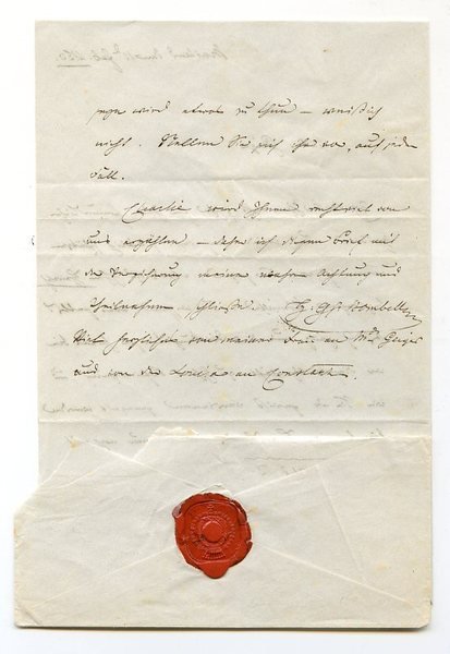 1¾ SS. auf Doppelblatt. Gr.-8vo. Mit eh. adr. Kuvert. An einen Joseph Geiger, "Chevalier des [Lég]ion d'honneur": "Ich danke Ihnen recht sehr für Ihre freundlichen Zeilen, und würde mich recht glücklich schätzen wenn ich, wie Sie sagen, etwas zu Ihrer Heirath beytragen könnte. Sie wissen aber selbst daß ich ganz aus dem Wirkungskreis heraus bin, wo dieses Geschäft zu Ihrer Befriedigung, und wie Sie es gewiß verdienen, geregelt werden könnte. Bey Hofe bin ich nur noch mit der guten Gräfin Schönborn im spärlichen Verkehre, und ich habe es nicht unterlassen Ihrer in meinem letzten Briefe so warm ich konnte zu erwähnen. Ob sie aber in der Lage seyn wird etwas zu thun - weiß ich nicht [.]". - Seit 1805 im österreichischen Kriegsdienst stehend, kämpfte der Sohn des französischen Generals, Diplomaten und späteren Bischofs von Amiens Marc Marie Marquis de Bombelles und Prinzessin Angélique de Mackau in Italien und 1813 als Hauptmann in der Völkerschlacht bei Leipzig, begleitete den Grafen Merveldt nach London und machte den Feldzug 1815 als Adjutant des Erzherzogs Ferdinand mit. "Später wurde er Gesandter in Petersburg, dann am portugiesischen und endlich am Turiner Hof. Im Jahr 1836 übernahm er in Wien die Erziehung der Enkel des Kaisers Franz II., des späteren Kaisers Franz Joseph und seiner Brüder, und begleitete sie im Mai 1848 auf ihrer Flucht nach Innsbruck. Metternich hielt Heinrich Franz von Bombelles für den geeigneten Erzieher des zukünftigen Thronfolgers [.] [Er] galt als eine der hervorragendsten Stützen des kirchlichen Einflusses bei Hof. Infolgedessen war er bei der österreichischen Bevölkerung verhaßt. Während der Revolution von 1848/49 bezeichneten die Revolutionäre ihn als 'Judas, den Erzschelm' und hängten ihn darstellende Strohpuppen als 'Urheber allen Übels'" (Wikipedia). - Bl. 1 mit einem kleinen Ausriß am unteren Rand (keine Textberührung).