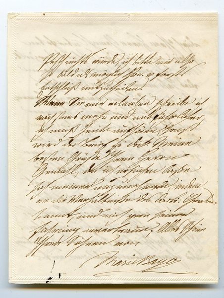 4 SS. auf Doppelblatt. Kl.-8vo. An eine Dame mit etwas verspäteten Wünschen zu Neujahr: "[.] Ich spiele diesen Winter so unendlich viel, daß ich kaum zu Ostern kommen kann; Devrient wird hier, wie überall[,] vergöttert und verehrt, und ich hatte das Glück in den zwey Jahren die ich hier bin mir die Achtung und Liebe des Publicums in hohem Grade zu gewinnen, so wird denn fast kein irgend bedeutendes Stück gegeben wo Devrient und ich nicht mitspielen, ich muß oft viermal die Woche dran, das nimmt dann so viel Zeit weg und und da geräth meine Correspdondenz ins Stocken [.]". - Die aus Prag stammende Schauspielerin, geb. Bayer, verh. Frfr. von Falkenstein, begann ihre Bühnenlaufbahn 1836 in Prag und wechselte 1839 an das kgl. Theater in Hannover. 1841 holte sie Ludwig Tieck an das Hoftheater in Dresden, dessen Ensemble sie bis zu ihrem Tod angehörte. Von 1850 bis 58 folgte sie mehrmals Einladungen Heinrich Laubes an das Wiener Burgtheater. Dort trat sie auch in Stücken von Franz Grillparzer auf und verhalf besonders dessen Trauerspiel "Des Meeres und der Liebe Wellen" zum Erfolg. Bayer-Bürck, deren Repertoire von der Sentimentalen über die Heroine bis zur Salondame reichte, spielte alle großen klassischen Hauptrollen. 1849 ehelichte sie den Schriftsteller August Bürck und nach dessen Tod 1863 den Oberstleutnant Julius Freiherrn von Falkenstein. - Mit zeitgenöss. Vermerk zur Adressatin am rechten Rand der Recto-Seite von Bl. 1.