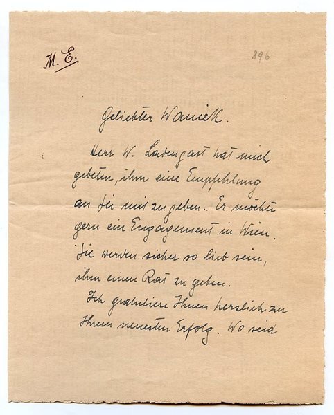 2 SS. auf Doppelblatt. Kl.-4to. An den Regisseur Herbert Waniek (1897-1949): "Herr W[alter] Ladengast hat mich gebeten, ihm eine Empfehlung an Sie mitzugeben. Er möchte gern ein Engagement in Wien. Sie werden so lieb sein, ihm einen Rat zu geben [.]". - Geboren in Prag, studierte Maria Eis an der Akademie für Musik und darstellende Kunst in Wien und verkörperte anfangs moderne, schillernde Frauencharaktere auf der Renaissancebühne und an den Kammerspielen; nach Tourneen mit großen Berliner Darstellern wie Paul Wegener gelang ihr 1925-32 am Thaliatheater und am Deutschen Schauspielhaus in Hamburg der Durchbruch zur großen Charakterschauspielerin und Tragödin. Von Anton Wildgans ans Wiener Burgtheater verpflichtet, war sie dort bis zu ihrem Tod in fast allen klassischen Partien - Medea, Iphigenie, Lady Macbeth und Kriemhild - zu sehen. Anläßlich der Wiedereröffnung des Burgtheaters 1945 spielte sie in Grillparzers "Sappho" eine ihrer größten Rollen. Nach dem Krieg sah man sie zunehmend auch im komischen Fach, zudem wirkte sie mit Erfolg auch in Operetten und zahlreichen Filmen mit. Zu ihrem Gedenken wurde eine Straße in Wien nach ihr benannt. - Auf Briefpapier mit gepr. Initialen; in altem Sammlungsumschlag.