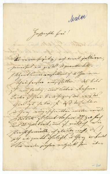 3 SS. auf gefalt. Doppelblatt. 8vo. An eine Grazer Galeristin: "Hochgeehrte Frau! Sie waren so gütig, sich bereit zu erklären, seinerzeit ein großes 'Aquarell-Bild' (Alpenblumen vorstellend) in Ihrem Schau-Fenster auszustellen. Das Bild ist nun fertig, und unter Rahme. Leider ist hier kein so großes weißes Glas zu haben, so daß dasselbe in Graz eingeschnitten werden muß. Das Bild ist samt Rahme 27 Zoll hoch und 32 Zoll breit, und ist wirklich ein Pracht-Gemälde, ich glaube nicht, daß sich ein zweites ähnliches in Graz vorfindet. Sie werden sicher entzückt sein über das Bild. Ich bitte nun, mir [!] gütigst wissen zu lassen, ob Sie es während der Zeit der Industrieausstellung ausstellen wollen, und den Verkauf vermitteln. Das Bild kostet samt Rahme 45 fl. - ein wahrer Spottpreis. Ich bitte aber, ein weißes Glas sogleich einschneiden zu laßen, das ich selbst bezahlen werde, da ich am 24. nach Graz komme. Sollten Sie das Bild preiswürdiger finden, was ich hoffe, so bitte ich selbes höher zu taxiren. Hier haben Kunstkenner es auf 70-80 fl. taxirt. Ich bitte Ihren Einfluß auszunützen zum Verkaufe. Es ist ja das Geld werth [.]". - Faltspuren. Auf der ersten Seite in blauem Kugelschreiber bezeichnet "Maler".