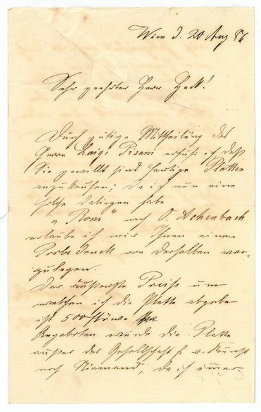 2 SS. 8vo. An den Kunsthändler Robert Heck (gest. 1924): "Durch gütige Mittheilung des Herrn Luigi Pisani erfuhr ich dass Sie gewillt sind fertige Platten anzukaufen; da ich nun eine solche daliegen habe ‚Rom' nach O. Achenbach erlaube ich mir Ihnen einen Probedruck von derselben vorzulegen […]".
