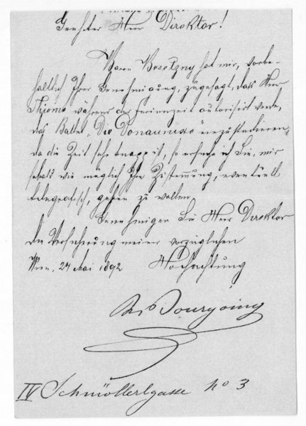 1 S. 8vo. An einen namentlich nicht genannten Direktor: "Baron Besetzny [Josef Freiherr von Bezécny, Theaterdirektor 1829-1904] hat mir, vorbehaltlich Ihrer Genehmigung, zugesagt, dass Herr Thieme [Otto Thieme, Tänzer, 1855-1900] während der Ferienzeit autorisiert werde, das Ballet ‚Die Daunaunixe' einzustudieren, da die Zeit sehr knapp ist, so ersuche ich sie, mir sobald wie möglich Ihre Zustimmung, eventuell telegrafisch, geben zu wollen [.]".
