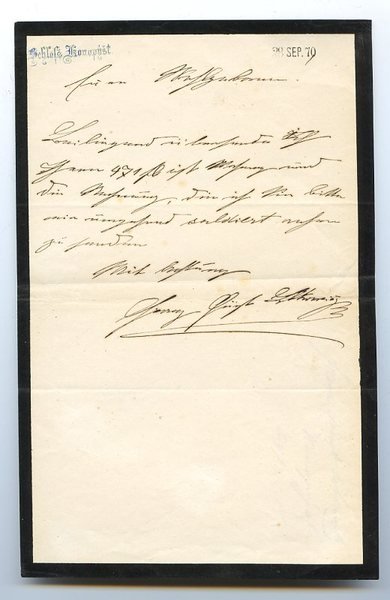 ½ S. auf Doppelblatt. Gr.-8vo. An einen namentlich nicht genannten Adressaten zur Begleichung einer Rechnung. - Mit gestemp. Briefkopf und schwarzem Trauerrand.