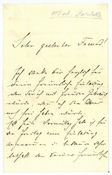 ½ SS. 8vo. Mit einer Beilage (s. u.). An einen namentlich nicht genannten Adressaten: "Ich danke Dir herzlich für Deine freundliche Einladung, von der ich mit Freuden Gebrauch [machen] würde, wenn ich den Abend noch frei haben würde. Erst heute Vormittag hatte ich für den Freitag eine Einladung angenommen [.]". - Gericke war Kapellmeister an der Wiener Hofoper, wo er u. a. die Wiener Erstaufführung von Wagners "Tannhäuser" dirigierte und als Nachfolger von Johannes Brahms seit 1880 zugleich als Dirigent der Gesellschaftskonzerte tätig war. 1884 übersiedelte er als Dirigent des Bostoner Symphonieorchesters nach Amerika, leitete von Beginn bis Mitte der 1890er Jahre wieder die Gesellschaftskonzerte in Wien und wirkte anschließend erneut als Leiter der Symphoniekonzerte in Boston. 1906 kehrte er als freier Dirigent und Komponist nach Wien zurück. Von seinen Kompositionen erschienen nur Lieder im Druck, seine Operette "Schön Hannchen" wurde 1865 in Linz aufgeführt. - Beiliegend eine Visitenkarte des Komponisten und Dirigenten Wilhelm Gericke, der "verbindlichst für die freundliche Besorgung von R. Strauss's Partitur 'Zarathustra'" dankt. - Die Verso-Seite mit kleinen Montagespuren.