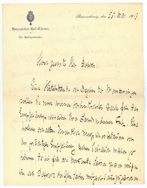 2 SS. Gr.-4to. An einen namentlich nicht genannten Adressaten: "Eine Viertelstunde vor Beginn der Meistersinger sollen Sie noch meinen verbindlichsten Dank für das Empfehlungsschreiben Ihrer Landsmännin Frln. Elsa Kolliner [?] erhalten. Unendlich muß ich es bedauern von Ihrer prächtigen Empfehlung keinen Gebrauch machen zu können, da wir für die kommende Saison sparen müssen [.]". - Richard Hagel leitete von 1900 bis 1910 das Stadttheater in Leipzig und war von 1919 bis 1925 Dirigent der Berliner Philharmoniker. - Auf Briefpapier mit gedr. Briefkopf.