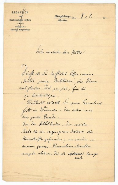 2 SS. auf Doppelblatt. Gr.-8vo. An den Musikwissenschaftler Richard Batka zur Übersendung seiner Schrift "Kritik zweier Partituren" und der Bitte um eine Besprechung derselben: "[.] Vielleicht sehe ich Sie zum Corneliusfeste in Weimar - das wäre mir eine grosse Freude. Von den Hebbelliedern - den meisten - habe ich im vergangenen Jahre die Reinschriften gefunden; sie werden in meiner grossen Cornelius-Quellenausgabe stehen, die ich nach langer Jahre stiller Arbeit - wer glaubt wohl was das für Mühe macht, unter Dach und Fach habe [.]". - Max Hasse war Musikreferent der "Magdeburger Zeitung", schrieb "Peter Cornelius und sein Barbier von Bagdad" und redigierte die Gesamtausgabe der musikalischen Werke von Cornelius im Verlag Breitkopf & Härtel. - Auf Briefpapier mit gedr. Briefkopf.