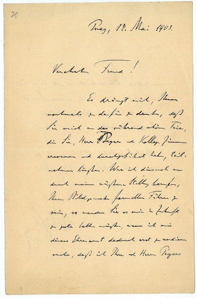 2 SS. Gr.-8vo. An einen namentlich nicht genannten Adressaten mit Dank für die "rührend schöne Feier", die der Adressat, "Herr Payer und Kollege Zimmer ersonnen und durchgeführt haben". - Alois Höfler war Professor für Pädagogik in Prag und Wien und stand in engem Kontakt mit Marian Smoluchowski, Friedrich Hasenöhrl und Walther Schmied-Kowarzik. Auf dem Gebiete der speziellen Unterrichtslehre der naturwissenschaftlichen Fächer (Mathematik, Physik, Astronomie) und des philosophischen Einführungsunterrichtes an Mittelschulen war Höfler einer der bedeutendsten Fachleute seiner Zeit" (ÖBL II, 353).