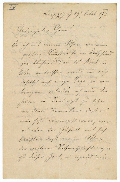 2 SS. auf gefalt. Doppelblatt. 8vo. An einen "[h]ochgeehrte[n] Herr[n]": "Da ich mit meinen Söhnen von einer größern Kunstreise in Deutschland zurückkehrend am 10. Novb. in Wien eintreffen werde, um auch daselbst noch einige Tage zu verbringen, erlaube ich mir Sie hievon in Kenntniß zu setzen mit dem Bemerken daß es mir sehr erwünscht wäre, wenn es eben der Zufall mit sich brächte, daß meine Söhne der weitern Bekanntschaft wegen zu dieser Zeit, in irgend einem Verein, oder wo Die es für würdig halten zu einem öffentlichen Auftreten gelangen könnten [.]". - In der oberen linken Ecke der 1. Seite spätere Kugelschreibernumerierung "IV".