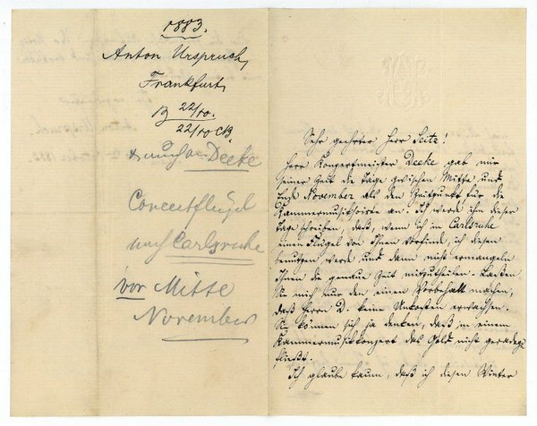 2½ SS. 8vo. An den Musikalienverleger Robert Seitz (1837-1889): "Herr Konzertmeister Deeke gab mir seiner Zeit die Tage zwischen Mitte und Ende November als den Zeitpunkt für die Kammermusiksoirée an. Ich werde ihm dieser Tage schreiben, daß, wenn ich in Carlsruhe einen Flügel von Ihnen vorfinde, ich diesen benutzen werde und dann nicht ermangeln Ihnen die genaue Zeit mitzutheilen. Laßen Sie mich nur den einen Vorbehalt machen, daß Herrn D. keine Unkosten erwachsen. Sie können sich ja denken, daß in einem Kammermusikkonzert das Gold nicht geradezu fließt. Ich glaube kaum, daß ich diesen Winter nach Leipzig komme. Daß ich von Ihrem freundlichen Anerbieten Gebrauch machen werde, wenn ich einst dorthin gehe, dürfen Sie dann überzeugt sein. Allein ich werde vor allem darauf bedacht sein, wenn ich das erste Mal als Komponist vor das Leipziger Publikum trete, daß dies mit meinem Werke geschieht, welches, wie meine Sinfonie, sich an das große Publikum wendet, und nicht mit Kammermusik, die nur den kleineren Kreis von Musikern interessiert. Ein oder das andere Mal wird man doch noch auf die Sinfonie zurückkommen. Einstweilen danke ich Ihnen herzlichst für die freundliche Aufnahme der Notiz in Ihrem geschätzten Blatte und verbleibe mit bestem Gruße […]". - Der Schüler Franz Liszts komponierte eine Symphonie, Klavierwerke, Kammermusik, Lieder sowie die Opern "Der Sturm" und "Das Unmöglichste von allen". Urspruch schrieb "Der gregorianische Choral" und die "Choralfrage" (1901). - Auf Briefpapier mit gepr. Initialen.