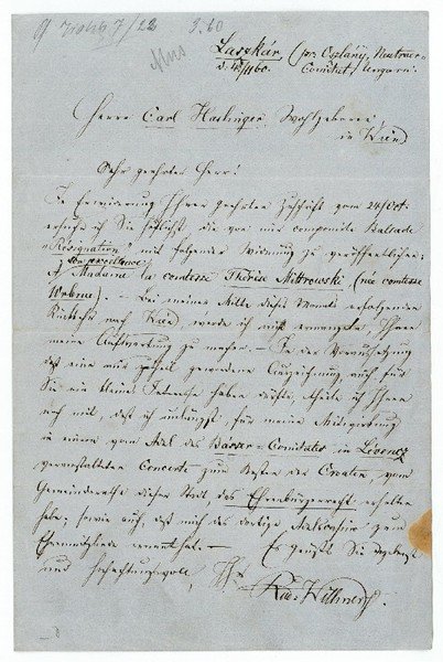 1 S. 8vo. An den Verleger Carl Haslinger (1816-1868) in Wien: "In Erinnerung Ihrer geehrten Zuschrift vom 24, Oct. Ersuche ich Sie höflichst, die von mir componierte Ballade 'Resignation' mit folgender Widmung zu veröffentlichen: À son excellence Madame la comtesse Thérèse Mittrowski (née comtesse Wrbna). - Bei meiner Mitte dieses Monats erfolgenden Rückkehr nach Wien, werde ich nicht ermangeln, Ihnen meine Aufwartung zu machen […]". - Der Schüler von Johann Nepomuk Hummel bereiste ab 1839 skandinavische Länder. Er wurde später Professor in Berlin und Wien und veröffentlichte viele Klavierwerke bei Verlagen in Kopenhagen, Berlin und Leipzig.