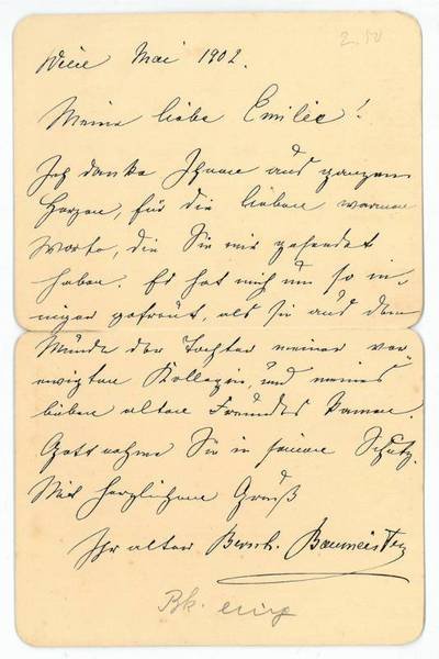 1 S. 8vo. An Emilie Koberwein, Tochter von Theodor Demuth: "Ich danke Ihnen aus ganzem Herzen, für die lieben warmen Worte, die Sie mir gesendet haben. Es hat mich um so inniger gefreut, als sie aus dem Munde der Tochter meiner verewigten Kollegin, und meines lieben alten Kollegen kamen. Gott nehme Sie in seinen Schutz […]". - Bernhard Baumeister, von Heinrich Laube nach Wien geholt, war 65 Jahre lang Ensemblemitglied des Wiener Burgtheaters. "'Sein Stil', sagt Jakob Minor, 'ist der echte, alte Burgtheaterstil, in einer starken und liebenswürdigen Individualität verkörpert'. 'Wo Bernhard Baumeister steht, da steht für die Kunst ein Wegweiser von den Künsten zurück zur Natur', formuliert Wilbrandt" (zit. n. Ernst Haeusserman, Das Wiener Burgtheater, Wien u. a., Molden, 1975, S. 61). Am Ende seiner langen Laufbahn angekommen, konnte der gleichermaßen als Regisseur gefragte Schauspieler auf 6299 Auftritte in 494 Rollen zurückblicken (vgl. Czeike I, 284).