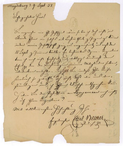 1 S. Gr.-4to. Mit rückseitiger Adresse und Siegelausriß. An den Sänger Ludwig Cramolini (1805-1884), als Gast in Hamburg: "So angenehm mir Ihr Gastspiel wäre so bin ich doch nicht im Stande Ihnen ein solches mit Bestimmtheit zusagen zu können indem meine Gesellschaft ganz neu organisiert und erst den 15. Sept. zusammen tritt. Ein bestimmtes Opern-Repertoir kann ich noch nicht festsetzen, weil ich zuvörderst den Erfolg, den die Leistungen meiner Mitglieder haben, abwarten möchte. Führt Sie indeß Ihre Reise hier durch so zweifle ich nicht daß wir uns verständigen und ich Ihren Wünschen entsprechen kann. Haben Sie den Postillon von Lonjemeau [!] noch nicht auf Ihrem Repertoir? [.]". - Carl Beurer war 1836-38 Direktor des Magdeburger Stadttheaters. Adolph Adams Oper "Der Postillon von Lonjumeau" erlebte seine Uraufführung am 13. Oktober 1836 in Paris, die deutsche Erstaufführung am 3. Juni 1837 in Berlin. - Etwas gebräunt und knittrig und mit starken Randschäden.