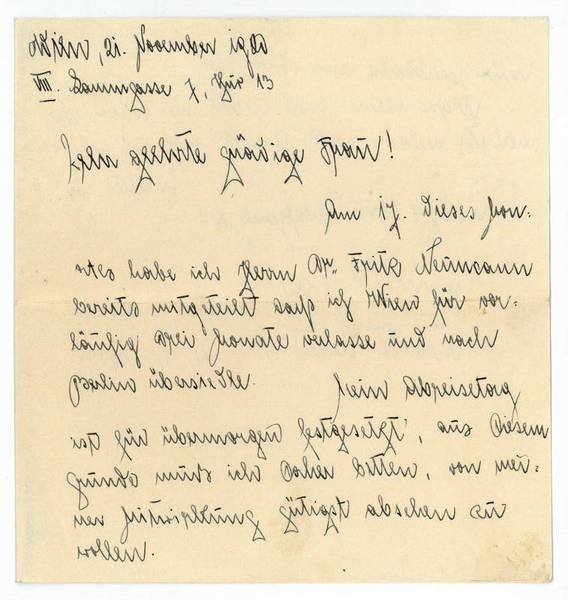 1 ½ SS. auf gefalt. Doppelblatt. 8vo. An eine namentlich nicht genannte Adressatin: "Am 17. dieses Monates habe ich Herrn Dr. Fritz Neumann bereits mitgeteilt, daß ich Wien für vorläufig drei Monate verlasse und nach Berlin übersiedle. Mein Abreisetag für übermorgen festgesetzt, aus diesem Grunde muß ich daher bitten, von meiner Mitwirkung gütigst absehen zu wollen. Ich werde mir erlauben, wenn ich wieder in Wien bin, mich sofort wieder in den Dienst Ihres idealen Wirkens zu stellen […]".