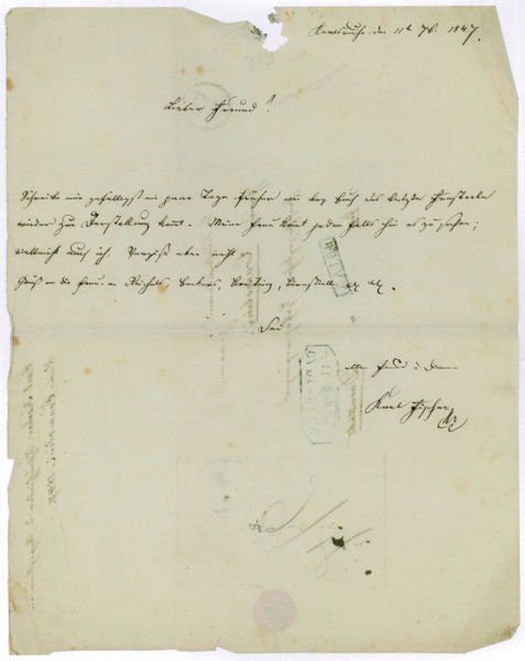 ½ S. 4to. Mit eh. Adresse (Faltbrief). An den Sänger Ludwig Cramolini (1804-1884) in Darmstadt: "Schreibe mir gefälligst ein paar Tage früher wenn bey Euch das letzte Fensterln [von Ignaz Lachner nach J. G. Seidl] wieder zur Darstellung kommt. Meine Frau kommt jedenfalls hin es zu sehen; vielleicht auch ich. Vergiß aber nicht [.]". - Karl Fischer war Oberregisseur des Schauspiels am Karlsruher Hoftheater. - Mit stärkeren Randläsuren und etwas fleckig.