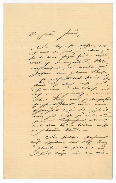 2 SS. auf gefalt. Doppelblatt. 8vo. An einen namentlich nicht genannten Adressaten: "Sie begreifen wohl, daß ich mit der Zeit eine etwas sonderbare Figur spielen dürfte, wollte ich der verzauberten Hose nachlaufen, wie weiland Jason dem goldnen Vlies. Ein verschustertes Kleidungsstück ist eben nicht zu reformieren u. die Sache wird nach u. nach peinlich, wenn Herr Lenz mit gesteigerter Empfindlichkeit immer wieder behauptet: "eine Kleinigkeit wär ja leicht zu ändern" - seine Versprechen aber mit dem besten Willen nicht nachkommen kann. Sie selber stehen auf Seiten des H. Lenz u. glauben ebenfalls, die Schuld läge nur an mir […]". - Ludwig Gabillon wurde 1853 ins Ensemble des Wiener Hofburgtheaters gerufen und unter der Direktion Heinrich Laubes vorwiegend als Charakterdarsteller eingesetzt; unter Franz von Dingelstedt führte er seit 1876 auch Regie. 1870 war er Mitbegründer des "Vereins Schröder" zur Unterstützung alter und bedürftiger Schauspieler.