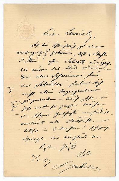 1 S. auf gefalt. Doppelblatt. 8vo. An den Schauspieler Joseph Lewinsky (1839-1924): "Ich bin schließlich zu der Ueberzeugung gekommen, daß ‚Stahl u Stein' ohne Schratt unmöglich. Wir würden das Stück ruinieren - bei aller Schwärmerei für den Schröder haben sich nicht allein Anzengruber zu gedenken - auch Ihr, die Ihr mit so großer Mühe die schwere Geschichte einstudiert verdient alle Anschrift […]". - Auf Briefpapier mit gepr. Briefkopf. - Ludwig Gabillon wurde 1853 ins Ensemble des Wiener Hofburgtheaters gerufen und unter der Direktion Heinrich Laubes vorwiegend als Charakterdarsteller eingesetzt; unter Franz von Dingelstedt führte er seit 1876 auch Regie. 1870 war er Mitbegründer des "Vereins Schröder" zur Unterstützung alter und bedürftiger Schauspieler.