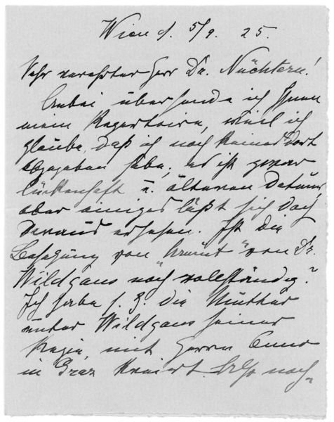 1½ SS. auf Doppelblatt. 8vo. An Hans Nüchtern: "Anbei übersende ich Ihnen mein Repertoire, weil ich glaube, daß ich noch keines dort abgegeben habe; es ist zwar lückenhaft u. älteren Datums, aber einiges läßt sich doch daraus ersehen. Ist die Besetzung von 'Armut' von Dr. Wildgans noch vollständig? [.]". - Der aus Wien stammende Journalist und Dramaturg Hans Nüchtern (1896-1962) war seit 1924 Leiter der literarischen Abteilung der RAVAG und unterrichtete auch an der Akademie für Musik und darstellende Kunst sowie am Max Reinhardt-Seminar.
