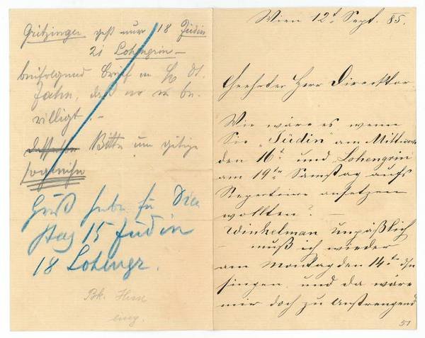 3 SS. auf gefalt. Doppelblatt. 8vo. Wie wäre es wenn Sie ‚Jüdin' am Mittwoch den 16ten und ‚Lohengrin' am 19ten Samstag aufs Repertoire ansetzen wollten? Winkelmann unpässlich, muß ich wieder am Montag den 14ten d M. singen, und da wäre mir doch zu anstrengend wenn ich den anderen Tag bei Ihnen singen sollte. Das hiesige Repertoire für die nächste Woche ist für mich sehr günstig vom Dienstag den 15ten bis 21ten werde ich auf keinen Falle hier beschäftigt - selbst wenn auch Winkelm. u. Müller absagen […]. Also lieber Herr Direktor ich bitte Sie mich güttigst [!] verständigen zu wollen wie Sie es eingetheilt haben […]". - Auf der Rückseite Notizen einer anderen Hand. - Gritzinger trat in die österr. Armee ein, wurde 1879 beurlaubt, studierte Gesang und wurde noch während der Ausbildung Chorist an der Wiener Hofoper. 1883 als Heldentenor in das Ensemble übernommen, wechselte er 1890 an das Hamburger Opernhaus, 1892 nach Dresden, 1895 nach Breslau und 1897 nach Nürnberg.