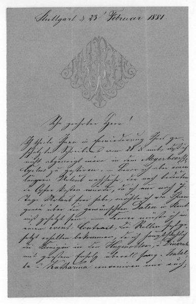 2 SS. 8vo. An einen namentlich nicht genannten Adressaten: "Ich theile Ihnen in Erwiederung [!] Ihres geschätzten Schreibens vom 21 d. M. mit, dass ich nicht abgeneigt wäre, in dem Meyerbeerschen Cyclus zu gastieren. - Bevor ich aber einen längeren Urlaub nachsuche, der mich bedeutende Opfer kosten würde, da ich nur noch 7 Tage Urlaub frei habe, möchte ich von Ihnen genau über die gewünschten Daten in Kenntniß gesetzt sein. - Ferner müsste ich in einen event. Contract, die Rollen festgesetzt erhalten bekommen, da ich hauptsächlich die Königin in den Hugenotten […] mit großem Erfolg überall sang […]". Auf Briefpapier mit gepr. Briefkopf. - Hanfstängl wurde in Paris ausgebildet und debütierte 1867 am kaiserlichen Théâtre Lyrique, wo sie bis 1870 blieb. Nach der Rückkehr nach Deutschland erhielt sie 1871 ein Engagement an der Hofoper in Stuttgart und wurde dort zur Kammersängerin ernannt. Tourneen führten sie u.a. nach Wien und an die New Yorker Metropolitan Opera; später war sie Mitglied des Frankfurter Stadttheaters und seit 1895 Gesangspädagogin am Hochschen Konservatorium.
