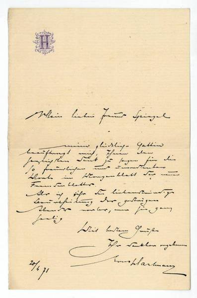 1 S. 8vo. An den Redakteur Edgar von Spiegl (1833-1908): "Meine glückliche Gattin beauftragt mich, Ihnen den herzlichsten Dank zu sagen für die so freundlichen und unverdienten Worte im Morgenblatt des neuen Fremdenblattes. Als ich ihr die liebenswürdige Beurtheilung des gestrigen Abends vorlas, war sie ganz seelig […]". - Auf Briefpapier mit gedr. Monogramm. Gefaltet. - Der aus Hamburg stammende Schauspieler wurde 1864 von Heinrich Laube ans Wiener Burgtheater geholt, wo er als Liebhaber und später als Bonvivant und Charakterdarsteller, seit 1880 auch als Regisseur erfolgreich war. Hugo von Hofmannsthal schreibt in seinem Nachruf: "Ich suche Hartmann in meinem Gedächtnis, und sehe zahllose Gestalten. Lebendig springen sie hervor, sein Clarence und sein Mercutio und sein König Heinrich und sein Leon [.]" (zit. n. Haeusserman, Das Wiener Burgtheater, Wien u. a., Molden, 1975, S. 58).