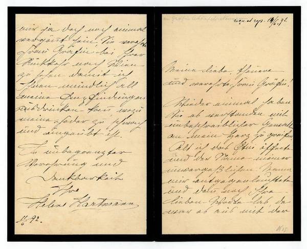 4 SS. auf gefalt. Doppelblatt. 8vo. An die Schauspielerin Louise Schönfeld-Neumann (1818-1905), Tochter des Schauspielerehepaars Karl Neumann und Amalie Haizinger: "Wieder einmal haben Sie es verstanden mit unbeschreiblicher Gewalt an mein Herz zu greifen. Als ich das Etui öffnete und der Name meiner unvergesslichen Mama mir entgegenleuchtete und dann noch Ihre lieben Worte las, da war es aus mit der Ruhe und meine Thränen flossen reichlich. Durch all den Trouble der Tage dachte ich nur immer und immer wieder an Sie und die schönen Tage in der Wipplinger-Strasse, die ich so glücklich war mit Ihnen Beiden verleben zu dürfen. Doch ich will nicht undankbar sein und Gott danken, dass ich zu den Bevorzugten gehöre, denen es, - wenn auch nur für kurze Zeit - gegönnt war - den Zauber Ihrer Persönlichkeit in sich aufzunehmen […]". - Auf Briefpapier mit schwarzem Trauerrand. - Helene Hartmann war seit 1860 Mitglied des Mannheimer Hoftheaters, nahm 1864 ein Engagement am Hamburger Thalia-Theater an und wechselte 1867 ans Wiener Burgtheater, wo sie, die anfangs naive und später Charakterrollen verkörperte, zur Hofschauspielerin aufstieg. Verheiratet war sie mit ihrem Kollegen Ernst Hartmann.