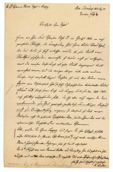 1 S. auf Doppelblatt. Gr.-8vo. An Hermann Carl Vogel, den Direktor des Astrophysikalischen Observatoriums zu Potsdam: "Einem von Ihrer Frau Schwester Elise P[olko] im Herbst 1862 an mich gerichteten Wunsche, die Correspondenz Ihres Herrn Bruders Eduard Vogel, der uns leider so früh entrissen wurde, ihr zum Druck eines Werkchens zuzusenden, vermochte ich leider nicht zu entsprechen, weil die meisten dieser Briefe als zum Druck ungeeignet bereits vernichtet waren, und die wenigen übrigen unter vielen anderen Briefen tief versteckt lagen. Nachdem ich nun beim Ordnen meiner Papiere eine Visitenkarte Ihres so früh dahingeschiedenen talentvollen Bruders Eduard und fünf seiner Briefe aus Leipzig, Berlin, London 1850-1852 noch glücklich aufgefunden habe, die sich aber auch wegen der darin vorkommenden zum Theil gewagten persönlichen Bemerkungen durchaus nicht zur Veröffentlichung eignen, so übersende ich diese wenigen Reliquien nicht der gefeierten Schriftstellerin Elise, sondern Ihnen den mit den astronomischen Verhältnissen vertrauten Astronomen [.]". - Luther war seit 1851 als Direktor der städtischen Sternwarte Bilk bei Düsseldorf tätig. "Neben Beobachtungen von veränderlichen Sternen und Kometen widmete sich Luther besonders den kleinen Planeten und ihren Bahnberechnungen. Er entdeckte u. a. Thetis, Aglaja, Proserpina und Bellona [.] Neben zahlreichen Fachveröffentlichungen schrieb er eine 'Geschichte der Düsseldorfer Sternwarte' (1898)" (DBE).