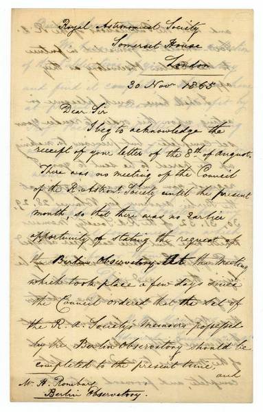 2 SS. auf Doppelblatt. 8vo. An den Astronomen Hermann Romberg vom Berliner Observatorium: "[.] We have looked over our collection of the Publications of your Observatory and find it complete, so that we have at present no occasion to profit by Prof. Foe[r]sters kind offer of sending us any volumes which we were in want of [.]".