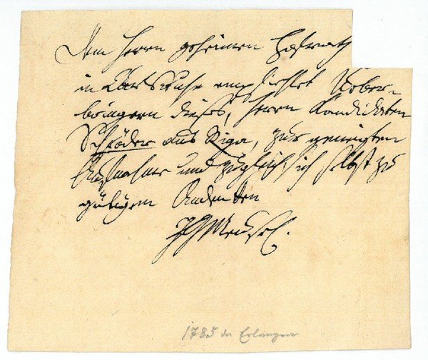 1 S. 89:104 mm. Empfehlungsschreiben an einen Hofrat für den "Herrn Kandidaten Schröder aus Riga". - Mit hs. Notiz am unteren Rand: "1785 in Erlangen"; der Name des Hofrats alt ausgeschnitten