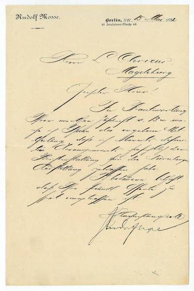 1 S. 8vo. An den Heraldiker Ludwig August Clericus (1827-92) in Magdeburg: "In Beantwortung Ihrer werthen Zuschrift v. 13. d. mache ich Ihnen die ergebene Mitthilung, daß ich bereits definitive Arrangements hinsichtlich der Berichterstattung für die Nürnberger Ausstellung getroffen habe! Ich bedaure lebhaft, daß Ihre freundl. Offerte zu spät eingetroffen ist […]". - Rudolf Mosse gründete 1867 in Berlin die "Annoncen-Expedition R. Mosse", errichtete bis 1873 in zahlreichen deutschen Städten sowie in Zürich und Wien Filialen und organisierte Anzeigenbeilagen in Zeitungen und Zeitschriften. 1871 gründete er das linksliberale "Berliner Tageblatt", 1889 die "Berliner Morgenzeitung" und kaufte 1904 die "Berliner Volkszeitung". Mosse war Mitglied der Repräsentantenversammlung der jüdischen Gemeinde und Förderer zahlreicher karitativer Institutionen. - Auf Briefpapier mit gedr. Briefkopf. Gefaltet.