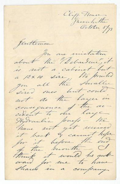2 SS. auf Doppelblatt. 8vo. An die "Wiener Photographische Gesellschaft", in technischen Fragen und zu seinen ausländischen Patenten: "Gentlemen. You are mistaken about the 'Debardeur', it is not a cabinet but a 12 x 10 size. We printed you all the smaller sized ones but could not do the larger in consequence of the accident to our large Hydraulic press. We have not yet received it back & cannot hope for it before the end of the month. I think it would be awkward for me to have shares in a company so far away & would rather dispose of my patents for Austria - either altogether or for half cash & half an interest in the Company. I enclose you a print from a negative of Luckhardts [.]". - Woodbury entwickelte 1864 die "Woodburytypie" (Photoglyptie), einen photochemischen Prozess, der zwischen ca. 1870 und 1900 vor allem in der qualitativ hochwertigen Buchillustration verbreitet war. Es handelte sich um die einzige kommerziell erfolgreiche Methode, feinste Abstufungen von Fotografien im Druck wiederzugeben. In den Jahren 1864-85 meldete Woodbury in England wie auch im Ausland über 30 Patente an, darunter solche zur Stereoskopie, Ballonphotographie, zu Dias, Filmen, und Projektoren.