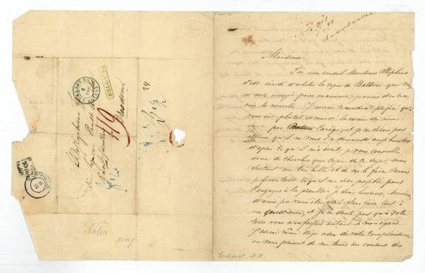 2 SS. auf Doppelblatt. 8vo. Mit eh. Adresse (Faltbrief). An den Kunsthändler Ernst Arnold in Dresden: "Par mon conseil Monsieur Stephens c'est décidé d'acheter la copie de Battoni que vous m'avez envoyé pour examiner; je viens d'en recevoir la nouvelle. J'aurais cependant préféré qu'il vous eut plutôt demandé la copie du même sujet par Corège,et je ne serais pas étonné qu'il ne vous l'a demande aussi bientôt d'après ce qu'il m'a écrit, je vous conseille donc de chercher une copie de ce sujet, mais surtout une très belle et de me le faire savoir. Je ferai tout ce qu'il me sera possible pour l'engager à la prendre. Je suis heureux, Monsieur, d'avoir pu vous être utile […]". - An der Akademie seiner Vaterstadt lernte Eeckhout das Modellieren und erlangte 1821 in Brüssel den Preis in der Bildhauerei für seine Skulptur Tod der Kleopatra. Seine Neigung trieb ihn aber zur Malerei, und schon 1824 errang das Gemälde Mädchen, einen Jüngling schachmatt setzend, zu Gent den ersten Preis. 1831 ließ er sich im Haag nieder und wurde 1839 daselbst Direktor der Akademie. 1844 ging er nach Belgien zurück und 1859 nach Paris, wo er 1861 starb. Eeckhout schöpfte eine Zeit lang seine Motive gern aus dem Leben der Scheveninger Fischer, kultivierte später aber mit Vorliebe das historische Genre (Wikipedia).