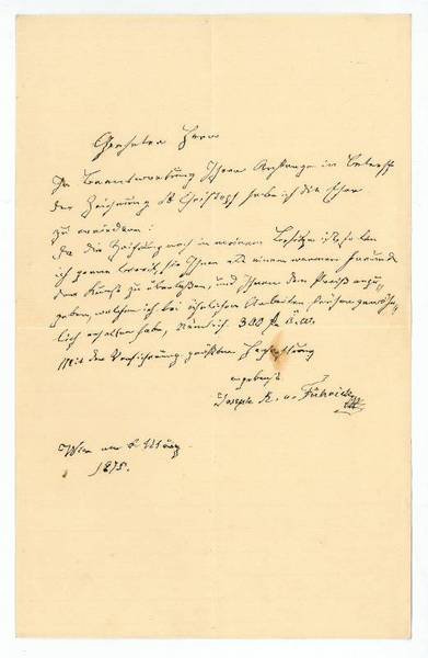 1 S. auf gefalt. Doppelblatt. 8vo. Mit eh. adr. Briefumschlag. An Alois Hauser in Wien: "In Beantwortung Ihrer Anfrage in Betreff der Zeichnung des Christoph. Habe ich die Ehre zu erwidern: Da die Zeichnung noch in meinem Besitze ist, so bin ich gerne bereit, sie Ihnen als einem warmen Freunde der Kunst zu überlassen, und Ihnen den Preiß anzugeben, welchen ich bei ähnlichen Arbeiten früher gewöhnlich erhalten habe, nämlich 300 fl O. W. […]". - Führich besuchte die Prager Kunstschule, lebte von 1827 bis 1829 in Rom, wo er unter der Leitung Friedrich Overbecks (1789-1869) u. a. mit Julius Schnorr von Carolsfeld an den Freskogemälden der Villa Massimo mitarbeitete, kehrte nach Prag zurück und zog anschließend (1834) auf Geheiß Metternichs als Kustos der gräflich Lambergschen akademischen Gemälde-Galerie nach Wien. 1844-46 schuf er seinen "durch zahllose Reproduktionen weltbekannt gewordenen Kreuzweg (Fresko) in der St. Johanneskirche in Wien (Praterstraße)" (Thieme-B. XII, 558). Nach seiner durch die Revolution 1848 bedingten Flucht nach Nordböhmen und seiner Rückkehr 1851 war Führich unter dem Ministerium Thun-Hohenstein für die künstlerische Fresken-Ausstattung der neuerbauten Kirche von Altlerchenfeld zuständig, "wozu er den gesamten Ideengang entwarf und ihn, durch Kupelwieser, Engerth, Blaas u. a. treulich unterstützt, im Verlaufe eines Jahrzehnts zur Ausführung brachte. Es ist dies das größte seiner Werke, für dessen glückliche Lösung Führich von Kaiser Franz Joseph I. durch die Erhebung in den erblichen Ritterstand ausgezeichnet wurde" (ebd.). Vgl. auch DBE und Öst. Lex. I, 362.