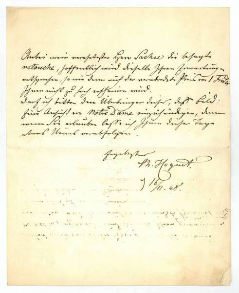 ¾ S. auf Doppelblatt. 4to. Anbei mein verehrter Herr Sachse die besagte retouche, hoffentlich wird dieselbe Ihren Erwartungen entsprechen, so wie denn auch der verabredete Preis von 1 Frid'or Ihnen nicht zu hoch erscheinen wird. Darf ich bitten dem Überbringer dieses, das Bild: Eine Ansicht von Notre Dame einzuhändigen [.]. - Seit 1848 in Berlin ansässig, entfaltete Hoguet eine außerordentliche Produktivität als Maler von Stilleben, Marine- und Landschaftsbildern. "Nach einem 1849 von ihm begonnenen Verzeichnis hat er in den letzten 2 Jahrzehnten seines Lebens nicht weniger als 422 Ölgemälde vollendet" (Thieme/Becker XVII, 310).