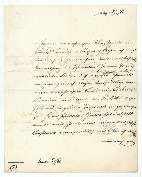 2 SS. auf Doppelblatt. Gr.-4to. An den Kunstverein in Leipzig mit der Mitteilung, daß auf besondere Anweisung des Hofmalers Johann Grund aus Baden-Baden eines von dessen Gemälden ("Gretchen im Kerker") eben an den Kunstverein "unversehrt und in gutem Zustande abgegangen ist".