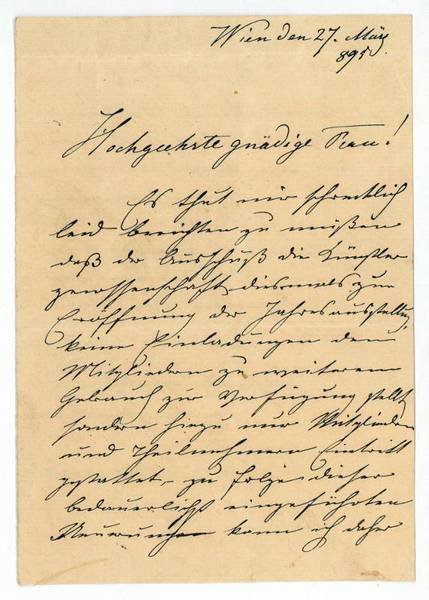2 SS. 8vo. Es thut mir schrecklich leid berichten zu müßen daß der Ausschuß die Künstlergenossenschaft diesmal zur Eröffnung der Jahresausstellung keine Einladungen den Mitgliedern zu weiterem Gebrauch zur Verfügung stellt sondern hiezu nur Mitgliedern und Theilnehmern Eintritt gestattet, zu Folge dieser bedauerlichst eingeführten Neuerungen kann ich daher heuer keine Karten übermitteln und muß in weiterer Consequence auf die Ehre verzichten gnädige Frau bei der diesjährigen Eröffnung begrüßen zu können wodurch großes Leid widerfährt […].