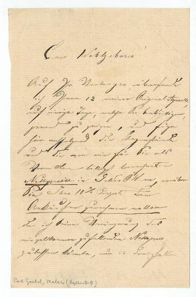 2 SS. 8vo. An einen namentlich nicht genannten Adressaten: "Auf Ihr Verlangen, übersende ich Ihnen 12 meiner Original Aquarelle, auf einige Tage, welche Sie beabsichtigen, jemand zu zeigen, und füge hier nachfolgend die Gegenstücke und die von mir für Sie als Vermittler billigst berechneten Nettopreise in Gulden Ö. W. an, worüber Sie Ihre 10% (Prozente) dem Ankäufer zurechnen wollen da ich keine Verringerung des mir vollkommen zufallenden Nettopreis zulassen könnte […]". - Aus einer Künstlerfamilie stammend, wurde Goebel von seinem Großvater mütterlicherseits, dem Bildhauer Joseph Klieber, erzogen und studierte bei ihm sowie bei Carl Gsellhofer an der Wiener Kunstakademie. Er orientierte sich an den Arbeiten Peter Fendis und Josef Danhausers, war als Porträtmaler an verschiedenen europäischen Höfen tätig und unternahm seit der Jahrhundertmitte zahlreiche Studienreisen durch Europa und nach Afrika. Goebel, der seit 1855 auch Bildnislithographien schuf, wurde bekannt durch Genrebilder (u.a. "Eingeschlafener Trommler", 1848), Wiener Veduten, Landschaften, Tier- und Jagdstücke.